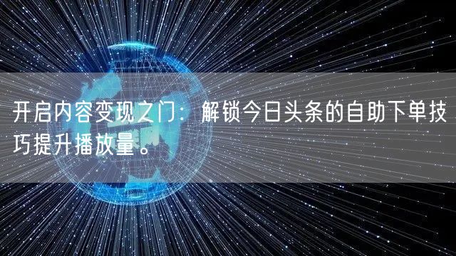 在今日头条平台上,内容的播放量直接决定了你的收益。因此,提升播放量是内容变现的关键。首先,你需要关注热门话题和趋势,创作符合用户需求的内容。其次,通过优化标题和封面,吸引更多用户点击。最后,运用自助下单技巧,将你的内容推荐给更多潜在用户,从而实现播放量的快速增长。